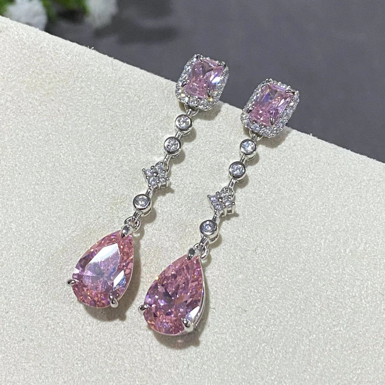 - Gemstones: Rectangular-cut and pear-cut pink gemstones, accented with round white stones