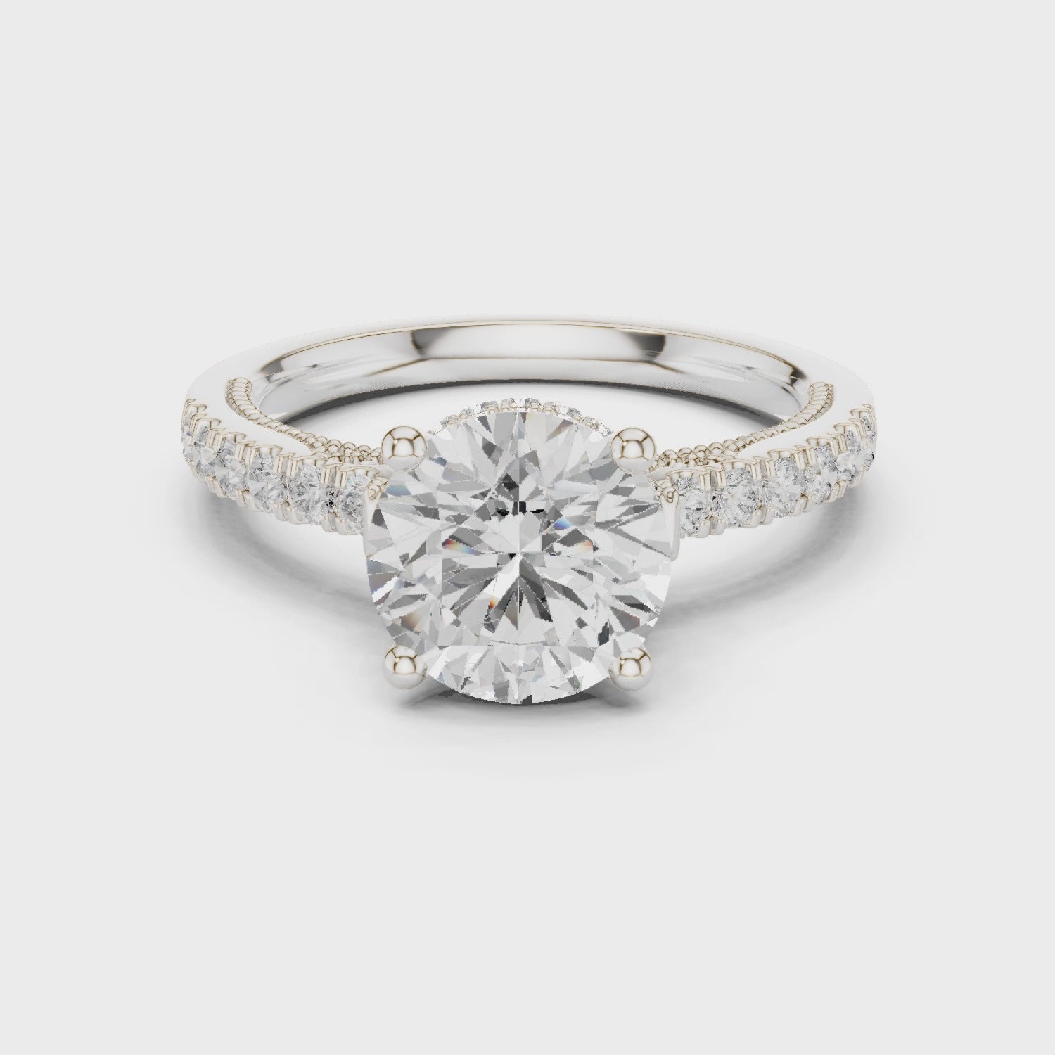 The slim band is adorned with precisely set pavé stones, creating a fine, continuous shimmer that complements the brilliance of the main stone without overpowering it. Its sleek and balanced silhouette offers a lightweight yet luxurious feel, making it perfect for both special occasions and everyday elegance.